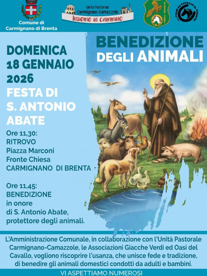 Domenica 18 gennaio 2026, a Carmignano di Brenta, in occasione della Festa di Sant’Antonio Abate, si terrà la Benedizione degli Animali, un momento che unisce tradizione, comunità e attenzione verso i nostri amici a quattro zampe!